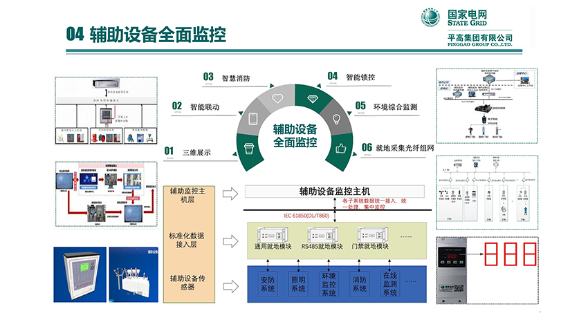 将变电站内辅助设施包括消防、安防、环境监测、照明、在线监测等设备信息通过协议转换装置,统一规约接入站控层网络,完成站内辅助设备数据处理、分析、展示、告警,实现对变电站的综合监测。同时系统具备变电站内主辅设备及辅助设备间智能联动等功能,可对变电站进行有效管控。适用于智能化变电站、无人值守变电站新建和改造工程。