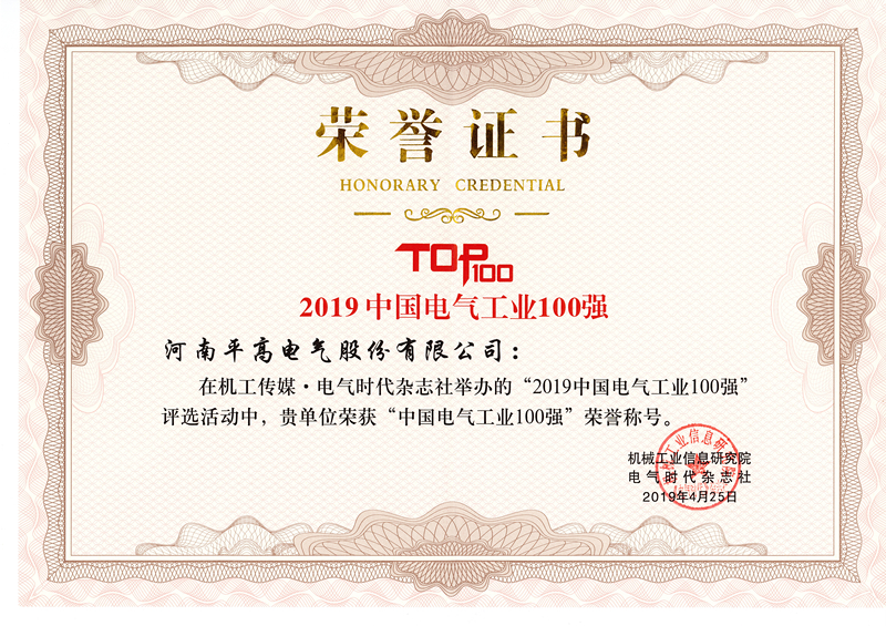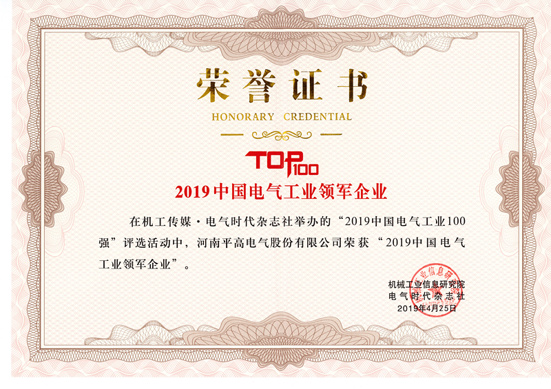 2019年4月25日,在由《电气时代》杂志社主办,中国电器工业协会和中国电力科学研究院协办的“2019年中国电气工业发展高峰论坛”上,平高电气获2019年度“中国电气工业领军企业”及2019年度“中国电气工业100强”两项荣誉称号。