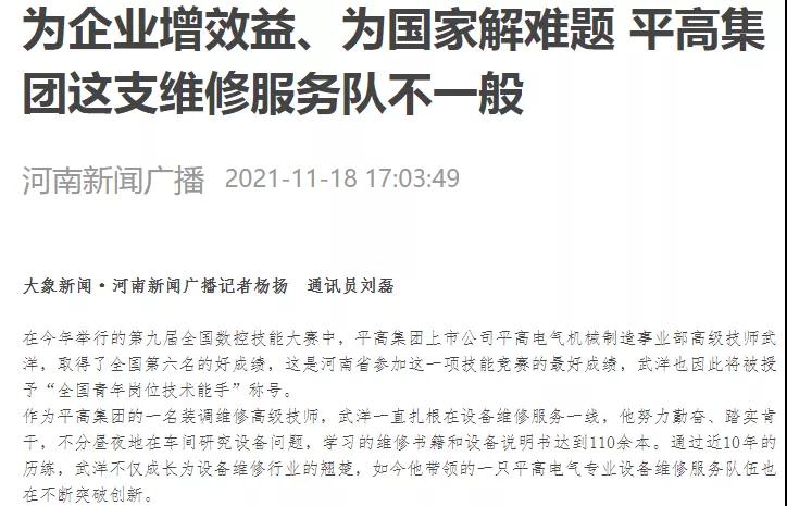 在今年举行的第九届全国数控技能大赛中,平高电气机械制造事业部高级技师武洋,取得了全国第六名的好成绩,这是河南省参加这一项技能竞赛的最好成绩,武洋也因此将被授予"全国青年岗位技术能手"称号。