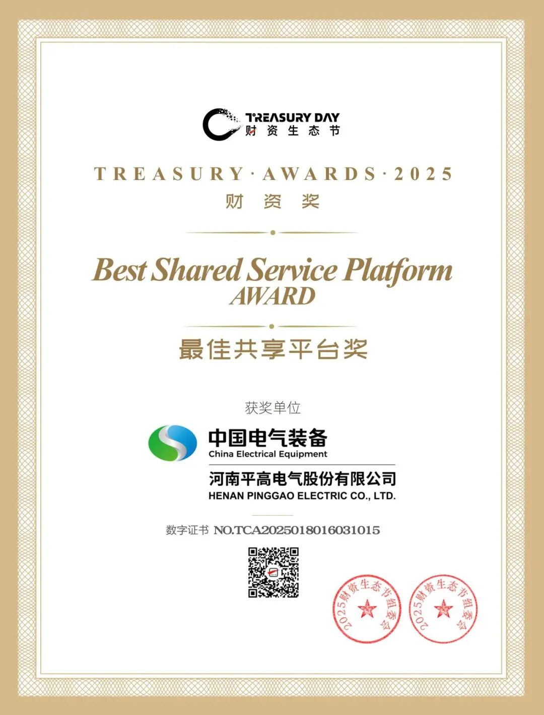 9月26日,平高电气在第六届财资生态节暨第十三届中国财资年会的2025财资奖(Treasury Awards 2025)评选中获得“最佳共享平台奖”(Best Shared Service Platform Award)。该奖项旨在表彰在财务共享中心建设方面具有出色表现的企业,充分体现了业界对平高电气财务共享创新实践的认可。