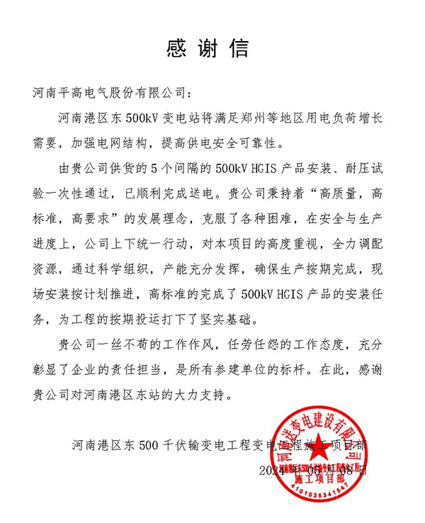 平高电气超特高压事业部收到了河南港区东电站施工项目部送来的感谢信和锦旗,客户对其高质量、高标准、高要求完成电站产品安装任务表示感谢。