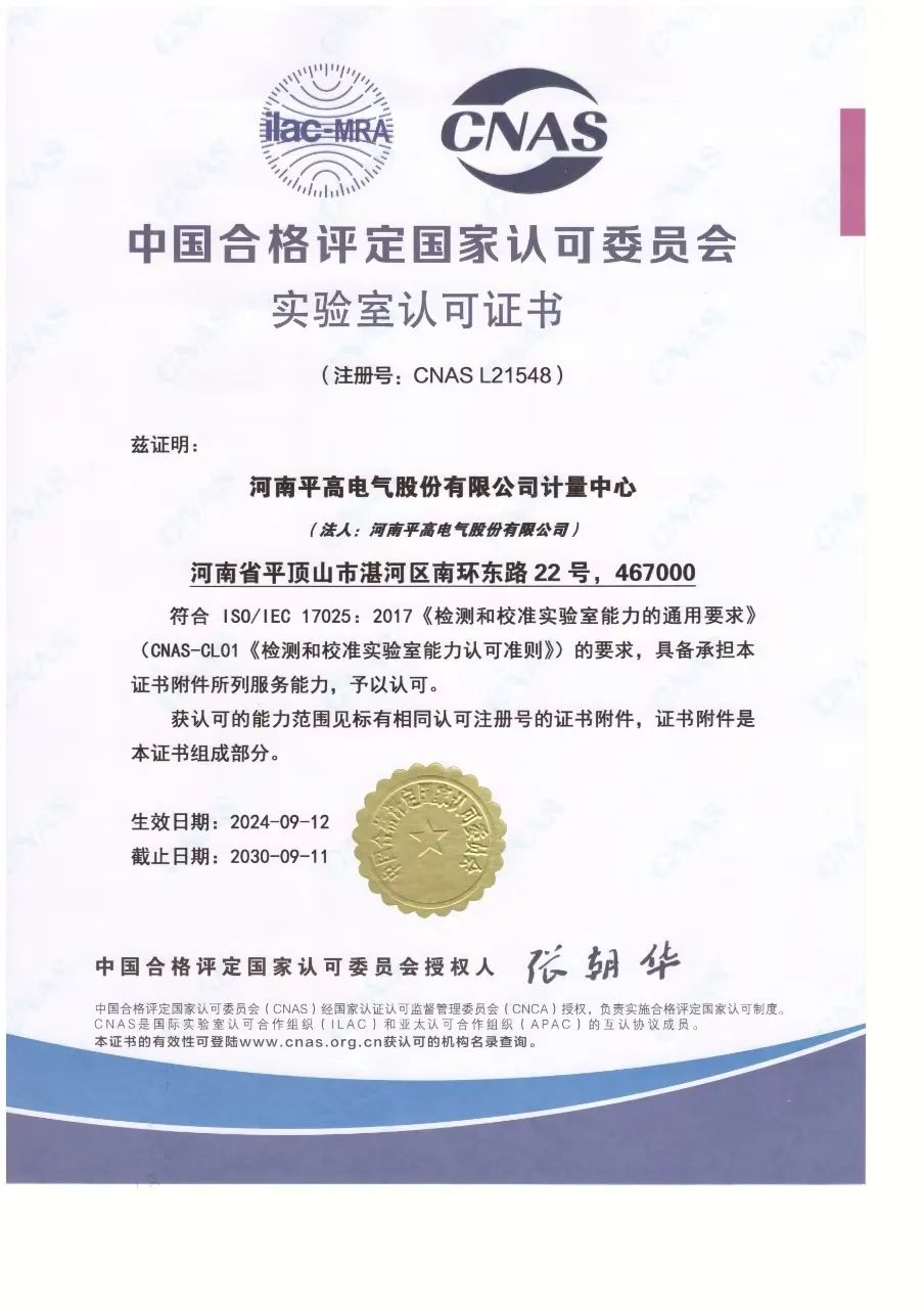 再获国家认可!平高电气一个实验室通过CNAS资质认证!
